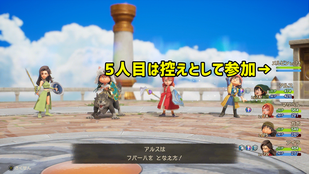 今作はオリジナル版とは異なり、5人目が仲間になったとしてもマリベルの家でお留守番するようなことはなく、冒険に同行しながら戦闘でも4人倒れた場合に控えから出てきて戦えるようになっています。