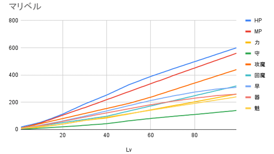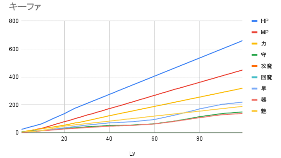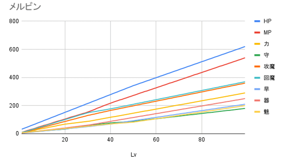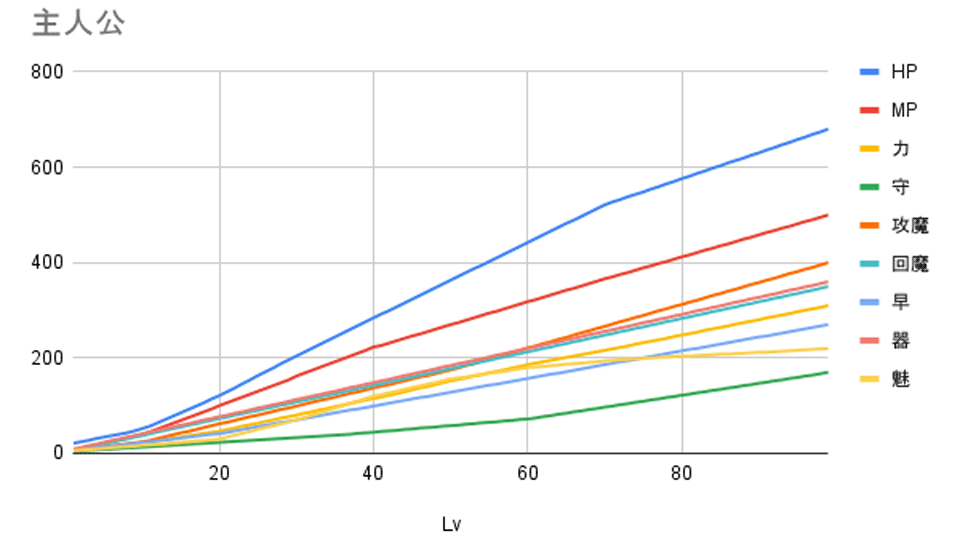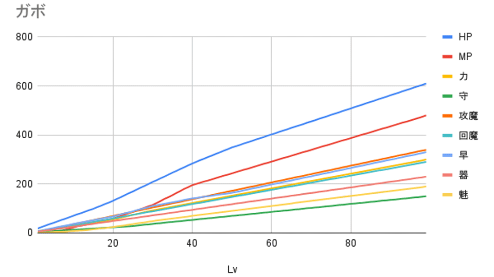ステータスの伸び方はこんな感じでどこかのレベル帯で大きく変化したりはしないので、Lv99時の順位とほぼ同じ並びで推移します。