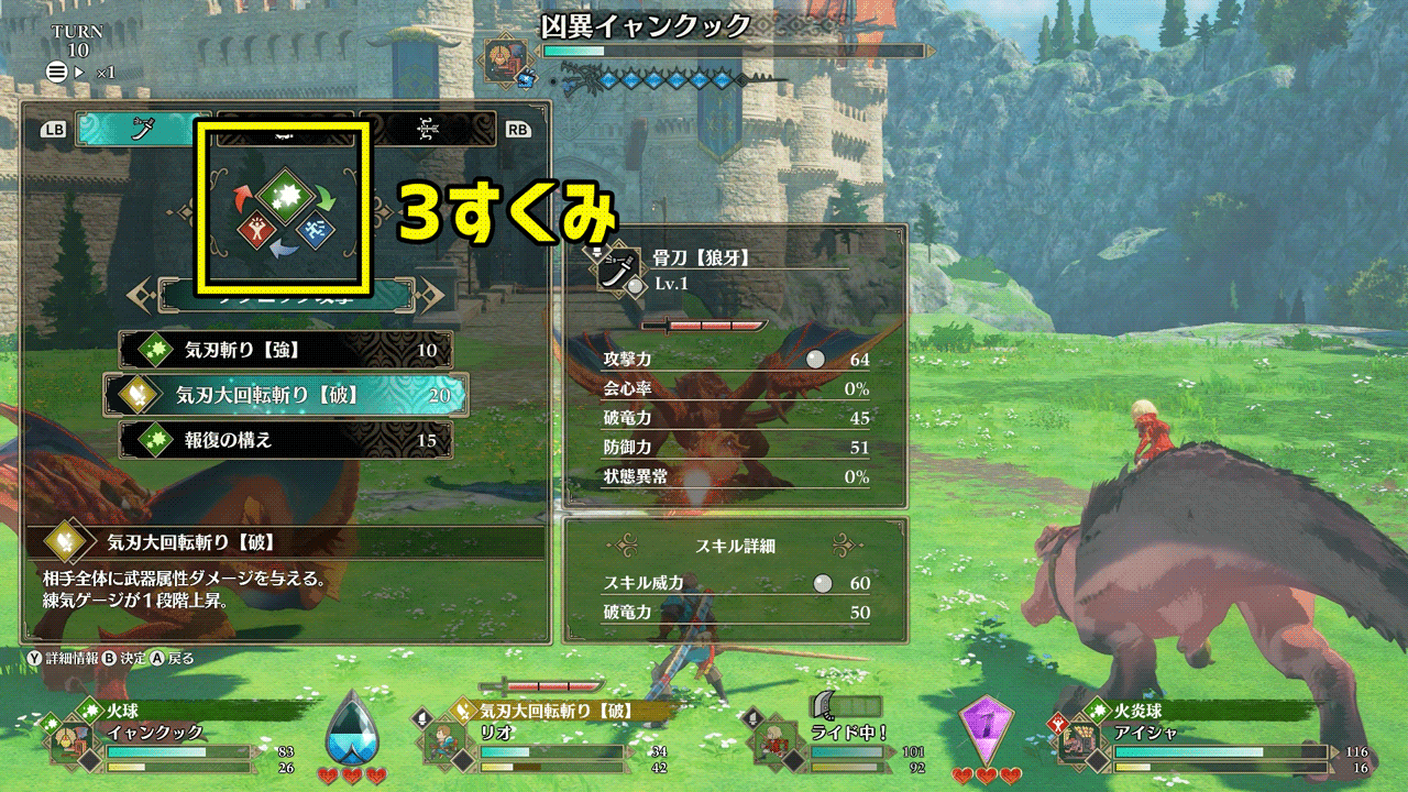 今までの3すくみに加えてさらに1つ要素が増えるので、侵獣戦はさらに考えてコマンドを選択する必要があります。