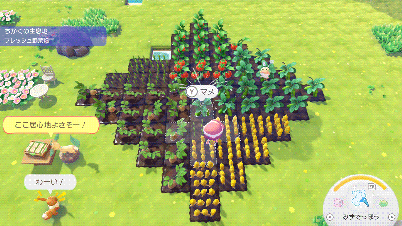 野菜集めは簡単です。2つ目の街のゴツゴツ山にスプリンクラーがあるのでそれを持ってくるか3Dプリンターで複製して畑に設置して、栽培が得意なポケモンに手伝ってもらうだけです。