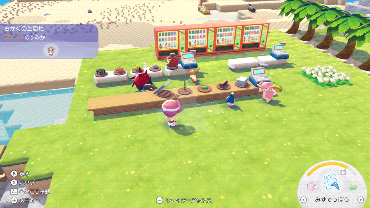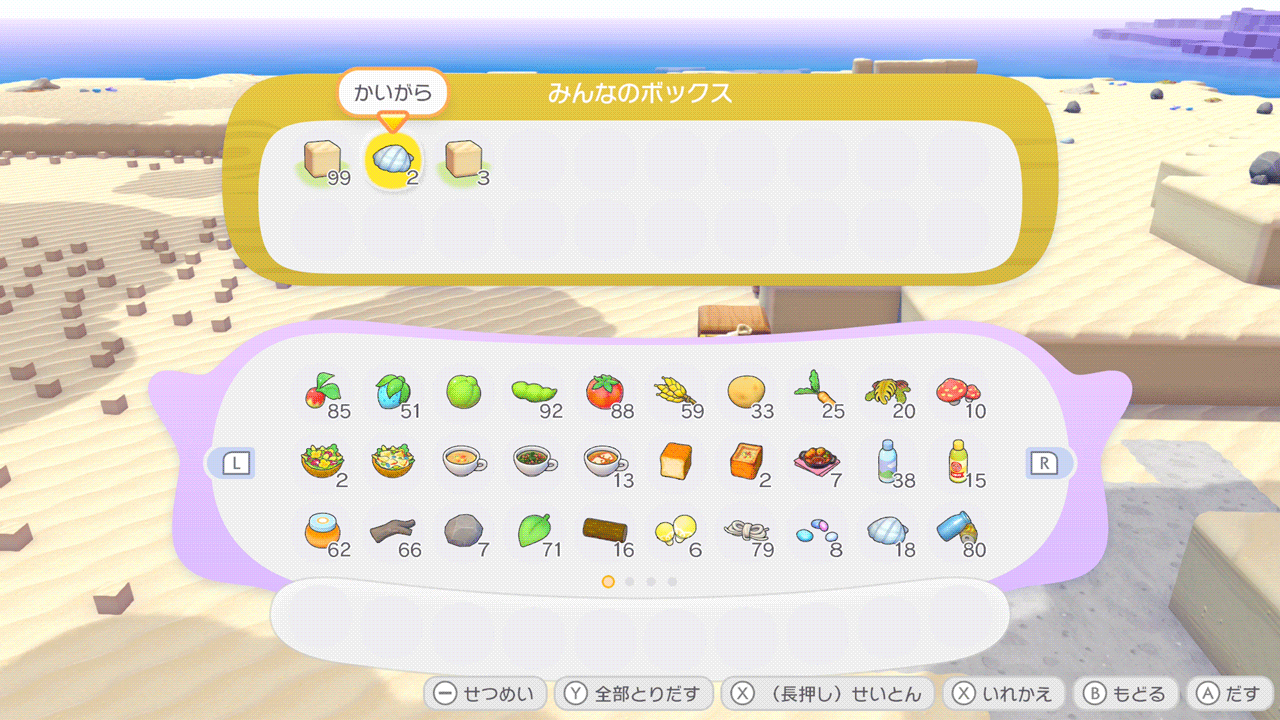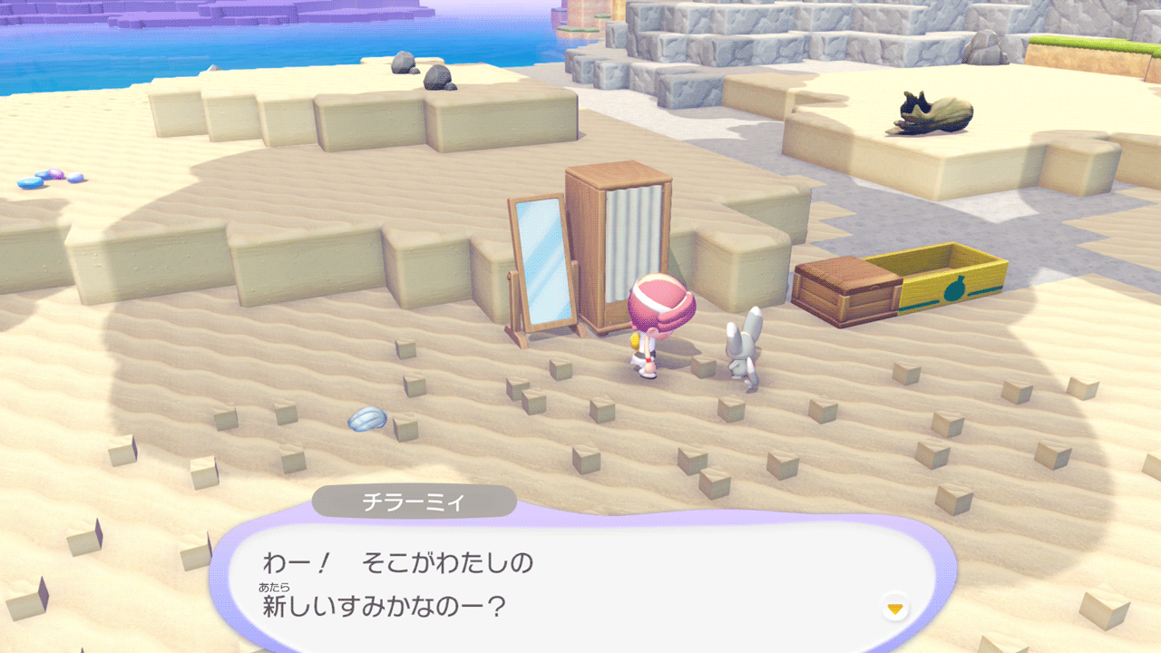 しわけるで集めてくれるアイテムはその場に落ちているものなら何でも回収してくれるようです。砂場ブロックと一緒に貝殻を拾ってくれたので、シーグラスや海藻も集めてくれることを期待してチラーミィを海岸に移しました。