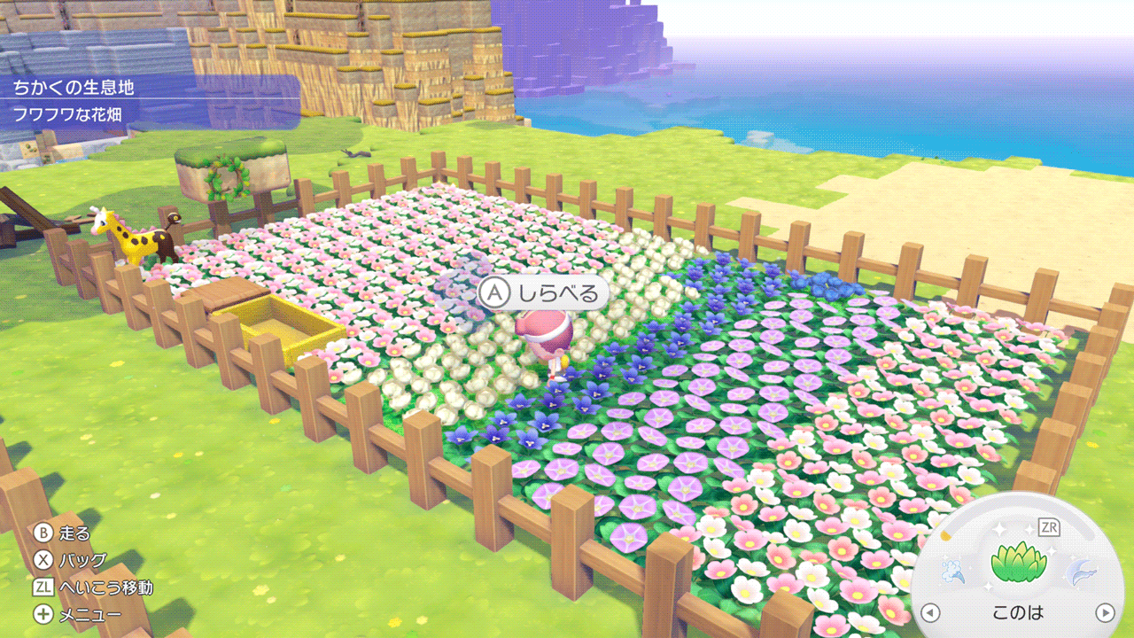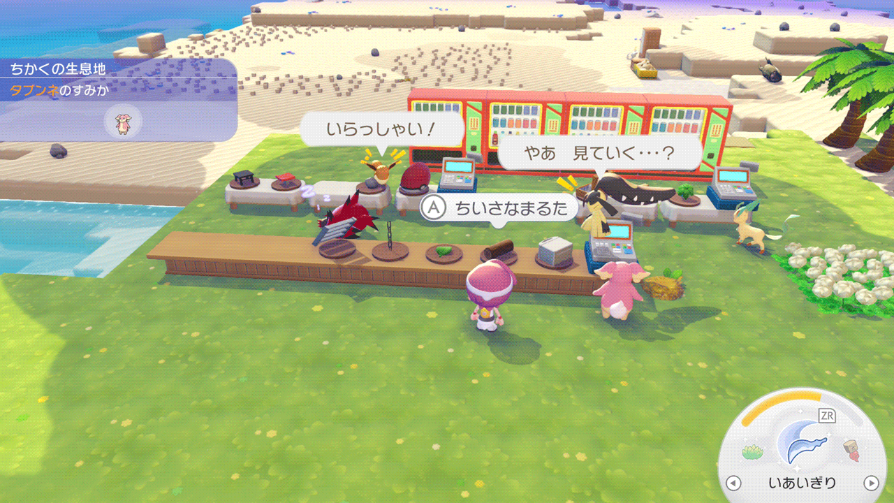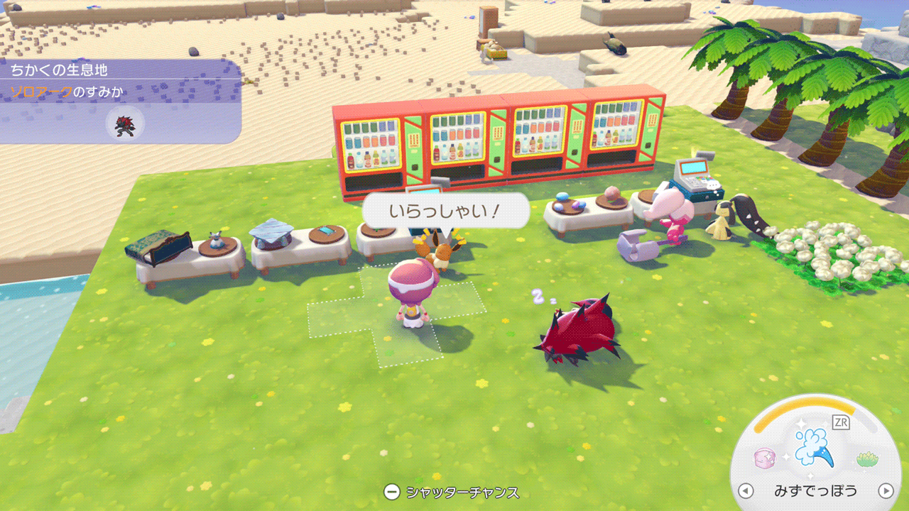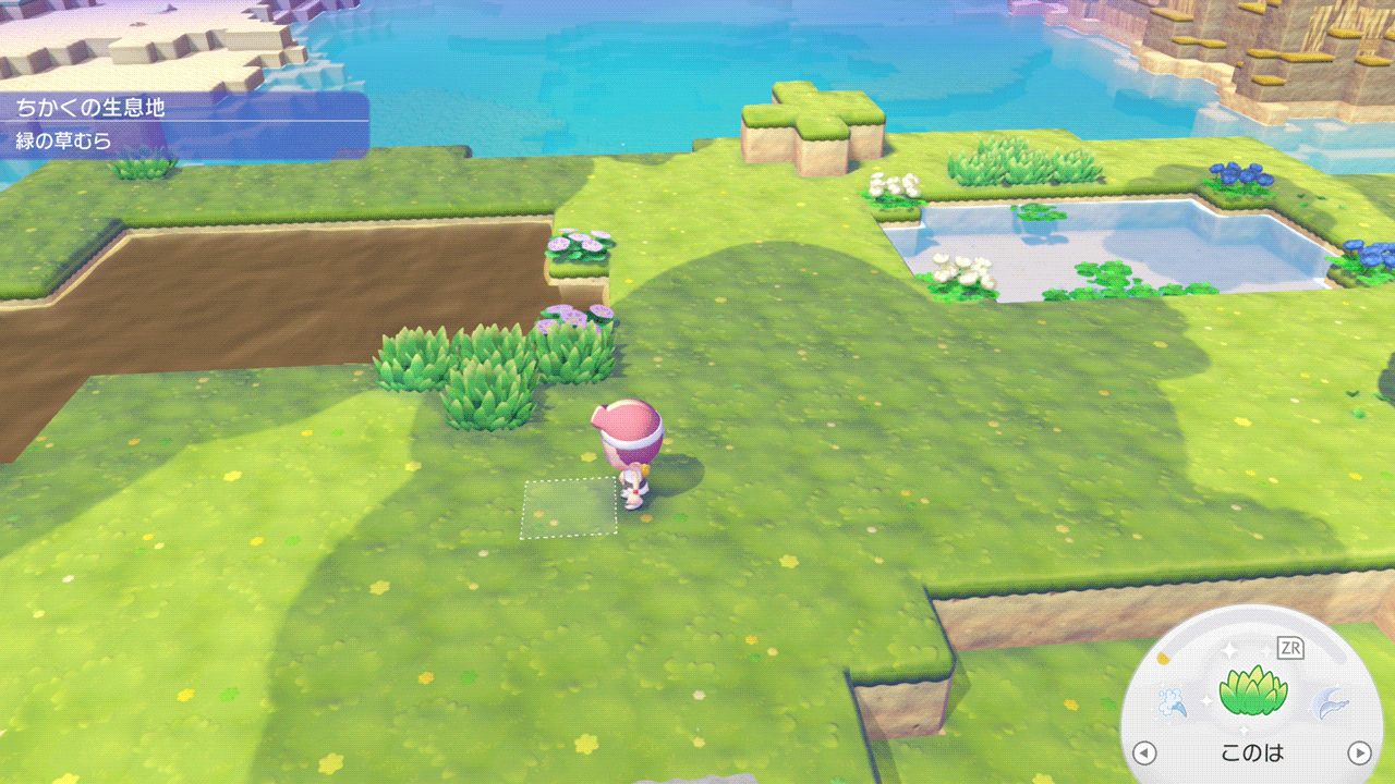 しわけるで集めてくれるアイテムはその場に落ちているものなら何でも回収してくれるようです。砂場ブロックと一緒に貝殻を拾ってくれたので、シーグラスや海藻も集めてくれることを期待してチラーミィを海岸に移しました。
