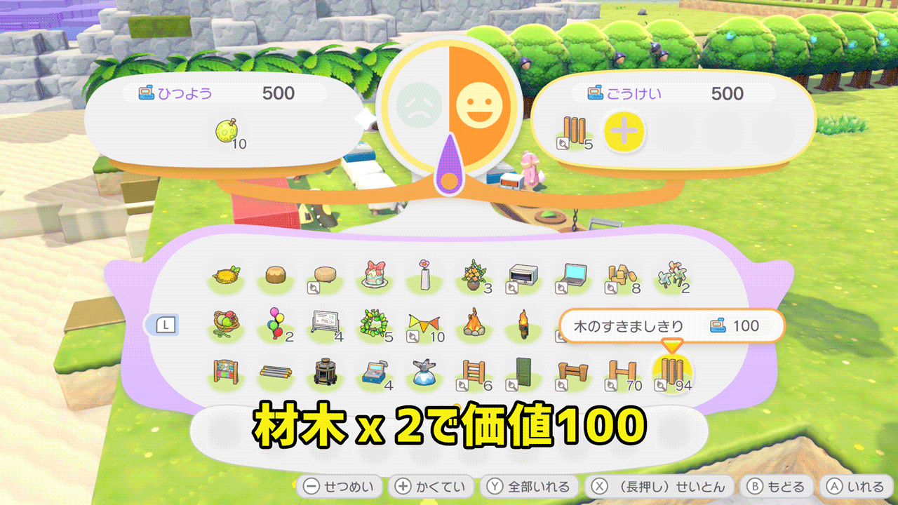 ざいもく(20)2つで木のすきましきり(100)が10個作れるので価値は40が1000にまで跳ね上がります。