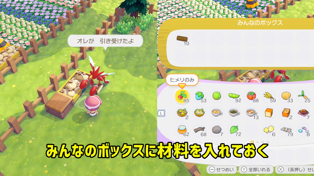 クラフト素材は「ちらかす」が得意なポケモンを一箇所に集中させて、「しわける」が得意なポケモンと「みんなのボックス」を設置するだけです。