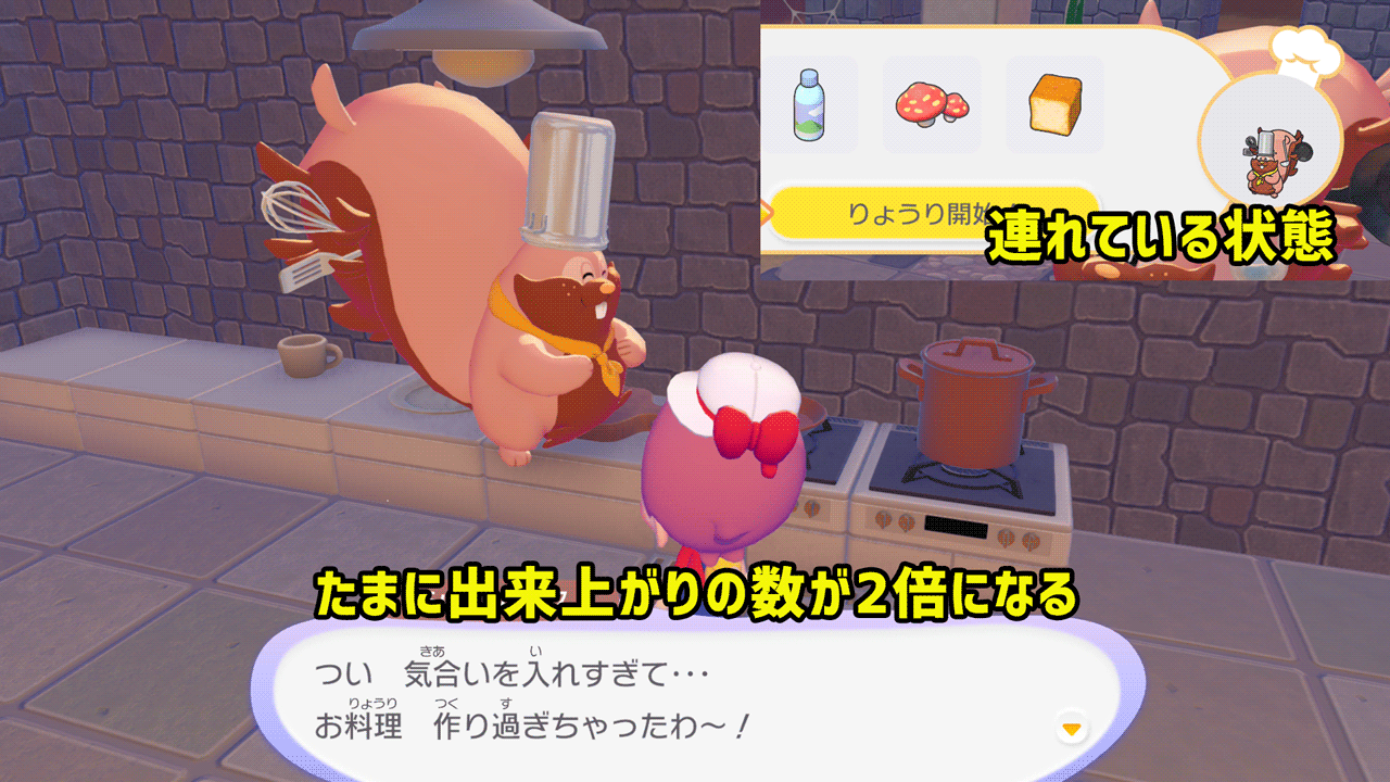 料理を作るときにシェフバリスを連れ歩いていると、ランダムで出来上がりの数が2倍になることがあります。