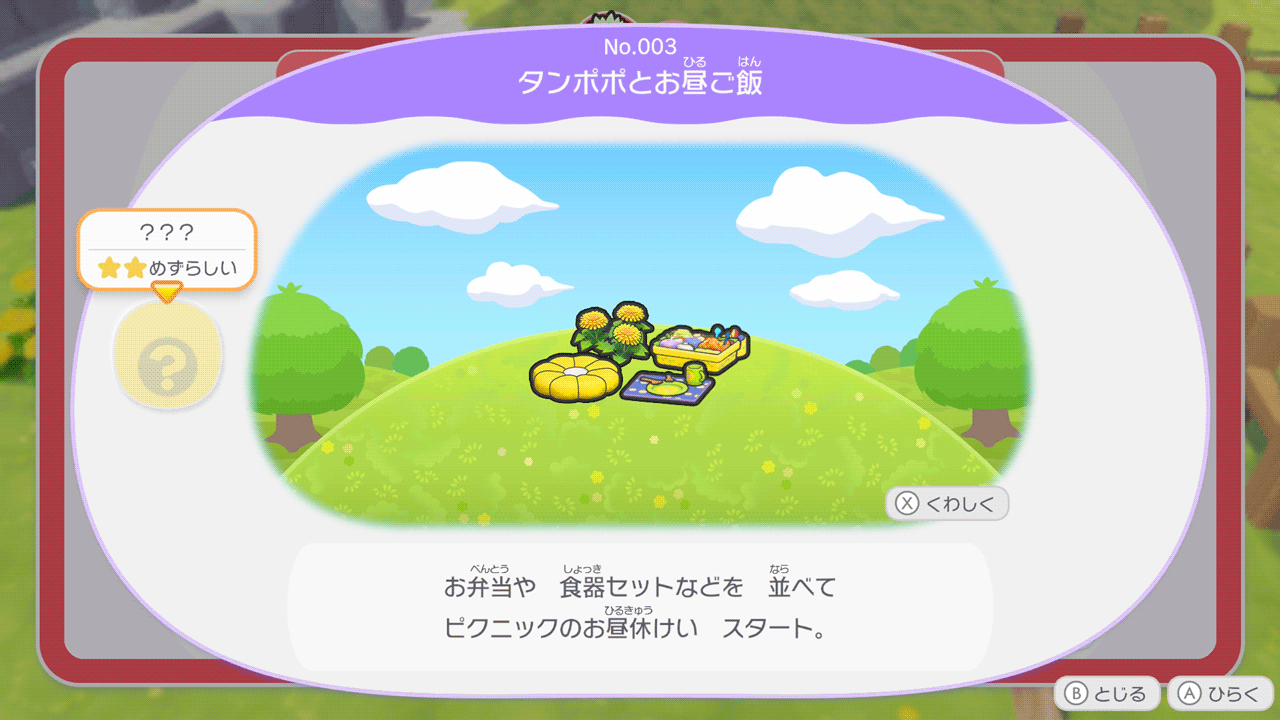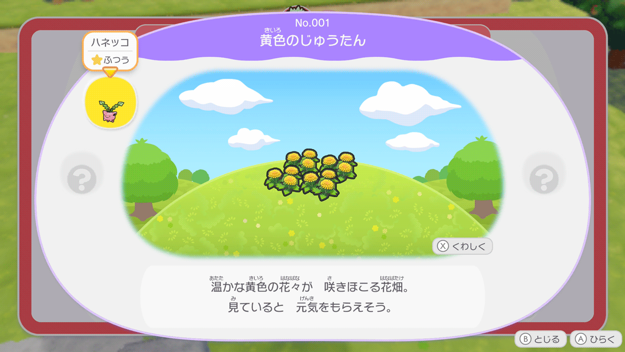 3匹とも「黄色のじゅうたん」がお気に入りなのでのどかなはなを4つ植えて使い回すだけでも良いですが、ポポッコは「遠足のおとも」ワタッコは「タンポポとお昼ご飯」で出やすくなっているので3つとも作ると早いです。