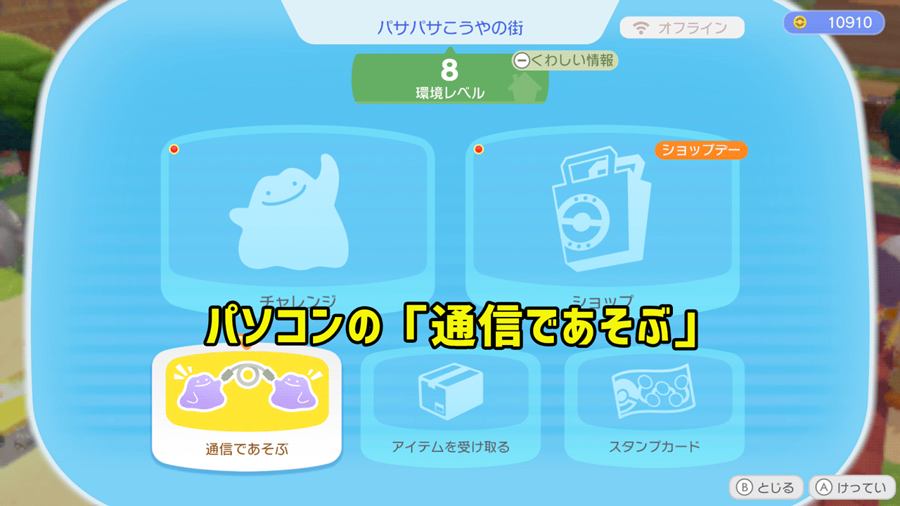 通信で遊ぶには一緒に遊びたい街のパソコン(クラウド島はどの街でも同じ)を調べて「通信であそぶ」を選びます。