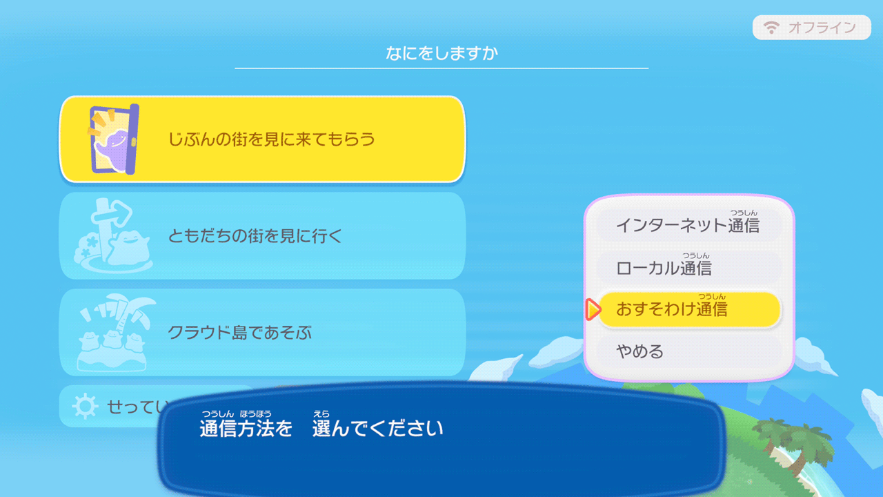 Switch2側でまっさらな街のパソコンでじぶんの街に来てもらう>おすそわけ通信を選びましょう。その後インターネットで遊ぶ場合は「ゲームチャット」、オフラインで遊ぶ場合は「近くの人と」を選びましょう。