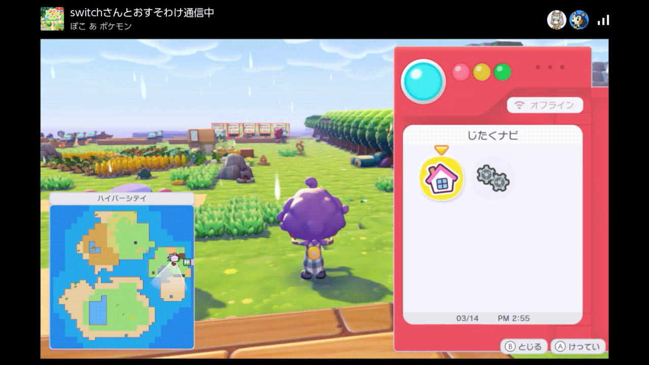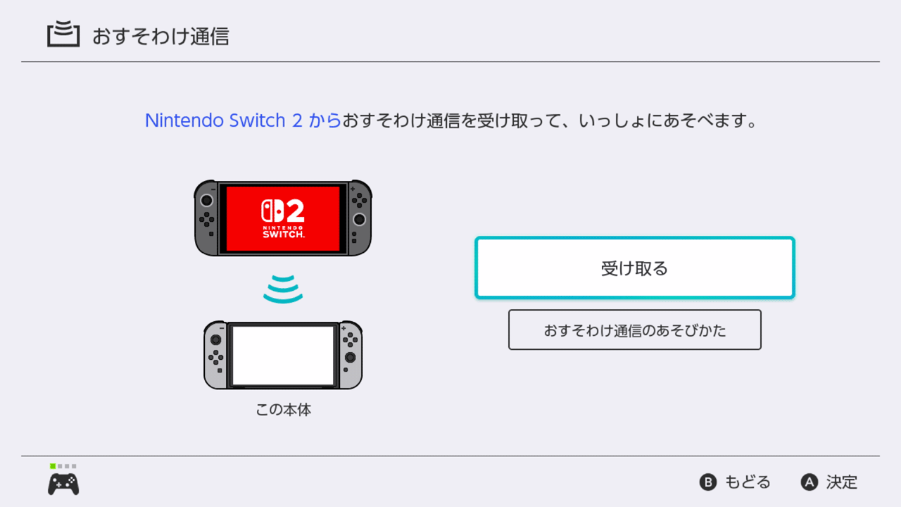 Switch1の本体ではホームメニューの下に並んでいる「おすそわけ通信」を選び「受け取る」で待ちます。