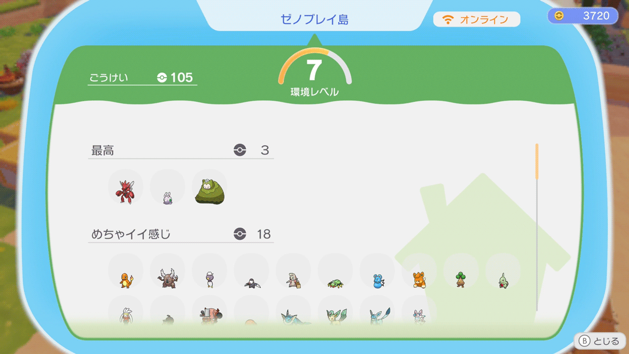 ポケモンは105/300まで埋まっている状態で、見つけた人はそのポケモンの親として名前が残るので、残したい人は住処を作って見つけましょう。