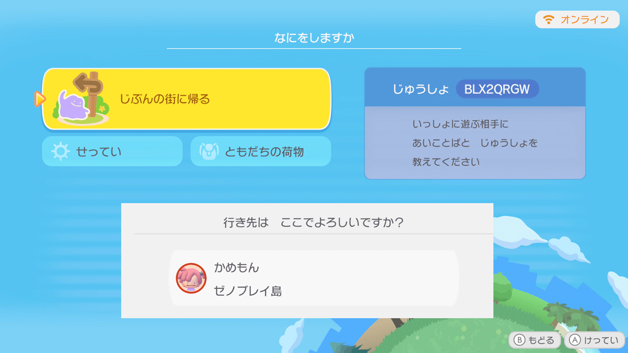 ちなみに私のゼノブレイ島(どう)の住所はBLX2QRGWです。