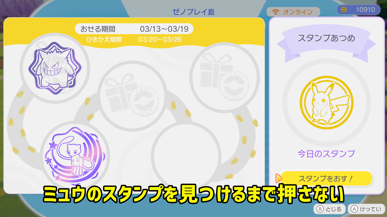 しかしスタンプには押せる上限回数があるようで、クラウド島のミュウは押せなくなっていることが多いみたいです。