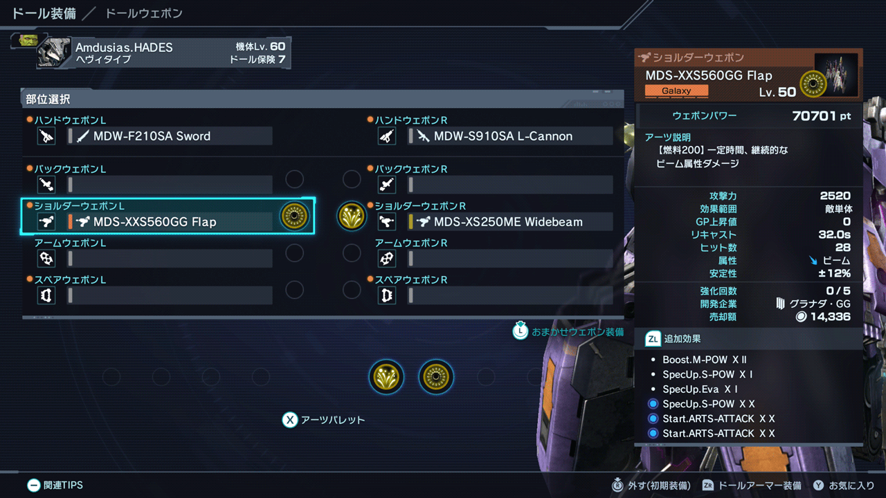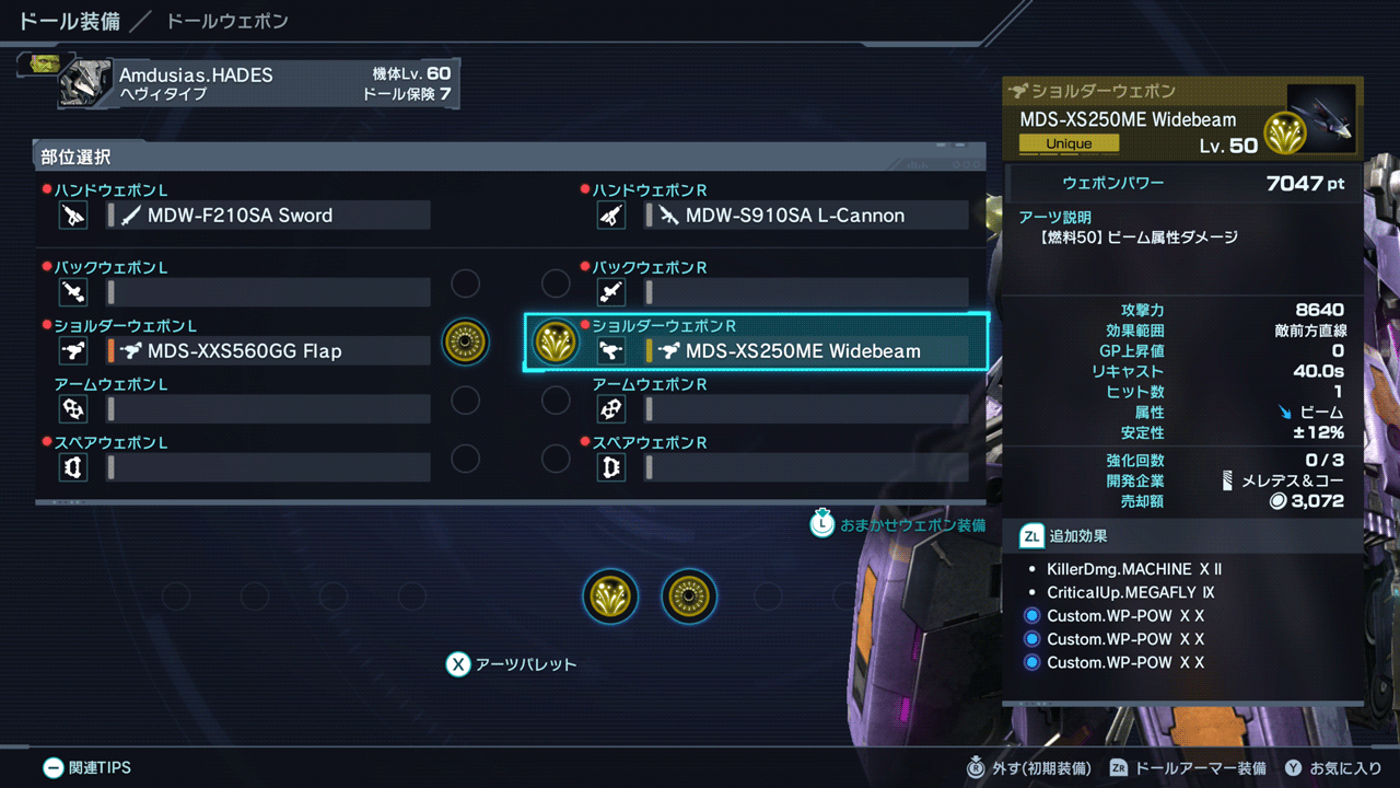 ドールの構成はショルダーウェポンRのWidebeamが必須です。ワイドビームが選ばれる理由としては攻撃時の乱数消費量が変わりにくいからです。