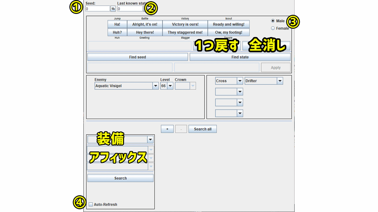 ④は探している装備に対して乱数があといくつなのかを計算する際に、チェックを入れておくと自動で計算してくれます。(Find stateからApplyを押したときに反映)