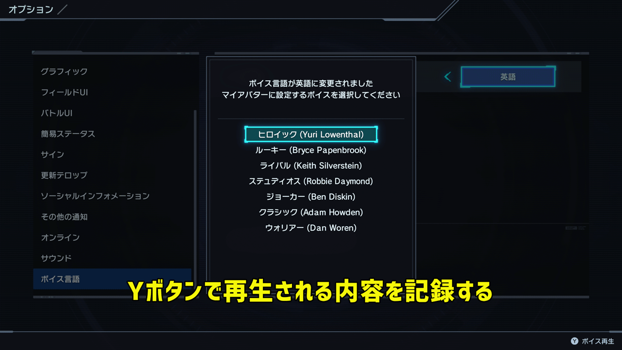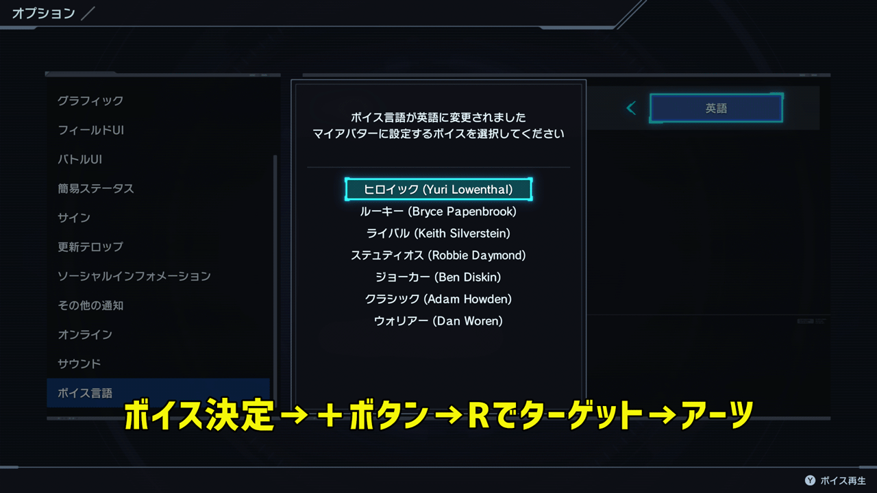 起動したら+ボタンでメニュー>オプション>ボイス言語を英語にします。