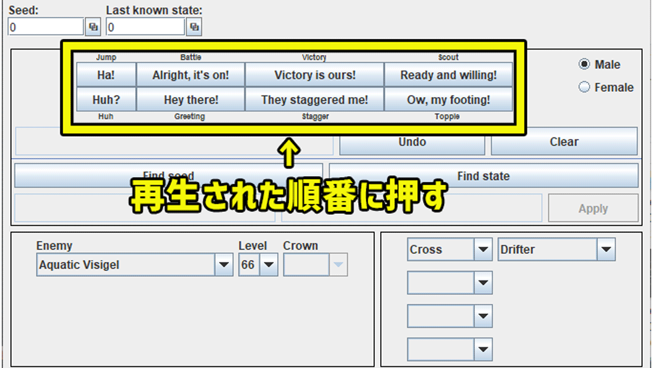 ②は現在の乱数位置です。こちはFind stateで乱数位置を特定したあとにApplyを押すと自動で更新されます。何らかの理由で位置を戻したくなった場合は手動入力で調整しましょう。