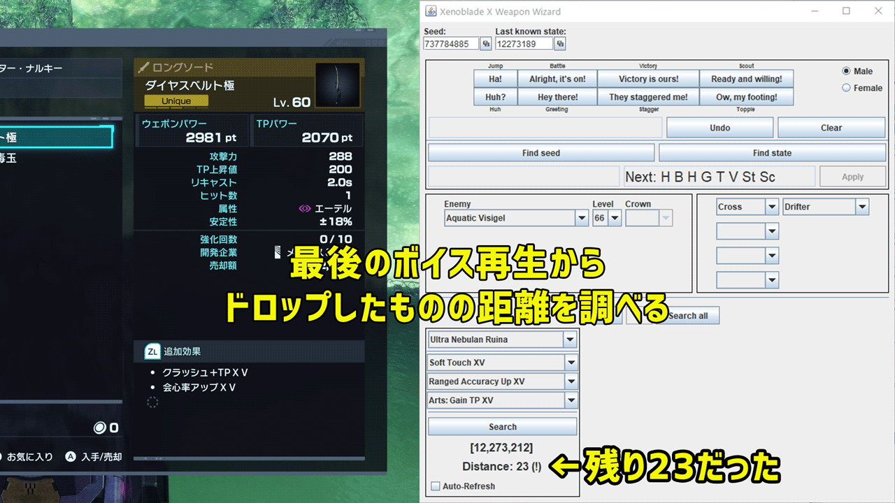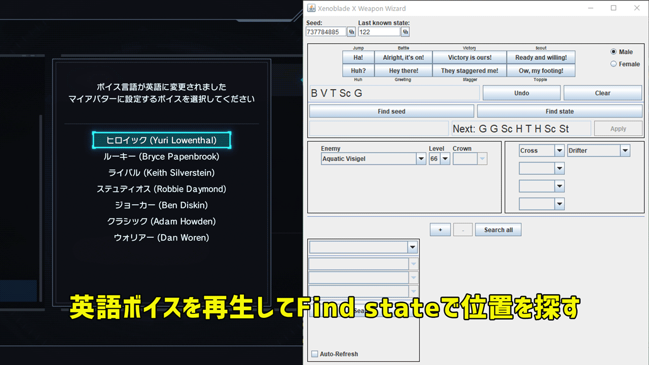 正確なSEED値が見つかると値が表示され、続けてYボタンを押したときに再生されるボイスのアクション名がNextとして表示されます。