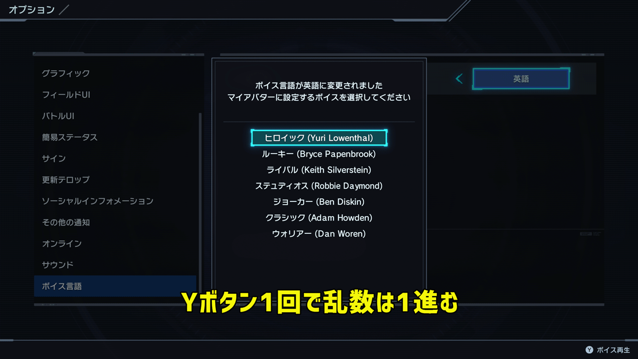 カメラと移動では乱数が大きく動きますが、ボイス言語の再生はYボタンを1回押すごとに乱数が1進みます。これのおかげでピッタリ狙った装備を出すことが出来ます。