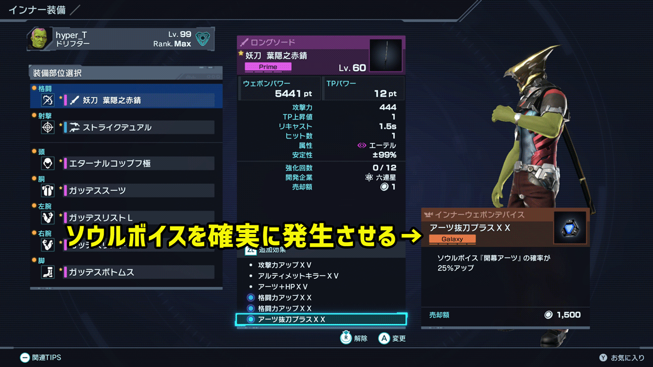 インナー装備にアーツ抜刀プラスXXのデバイスを追加することで、確定で開幕アーツのソウルボイスが発生、これによりナルキーを倒した際にランダムで発生する可能性のあるソウルボイスを抑制できます。